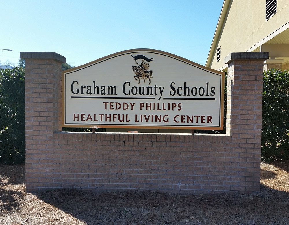 We manufacture a wide variety of sign work here at Savnac Canvas & Signs. Everything from digital printing, vinyl graphics, vehicle decals, canvas prints, and sandblasted signs, as seen below in the Graham County School picture.
